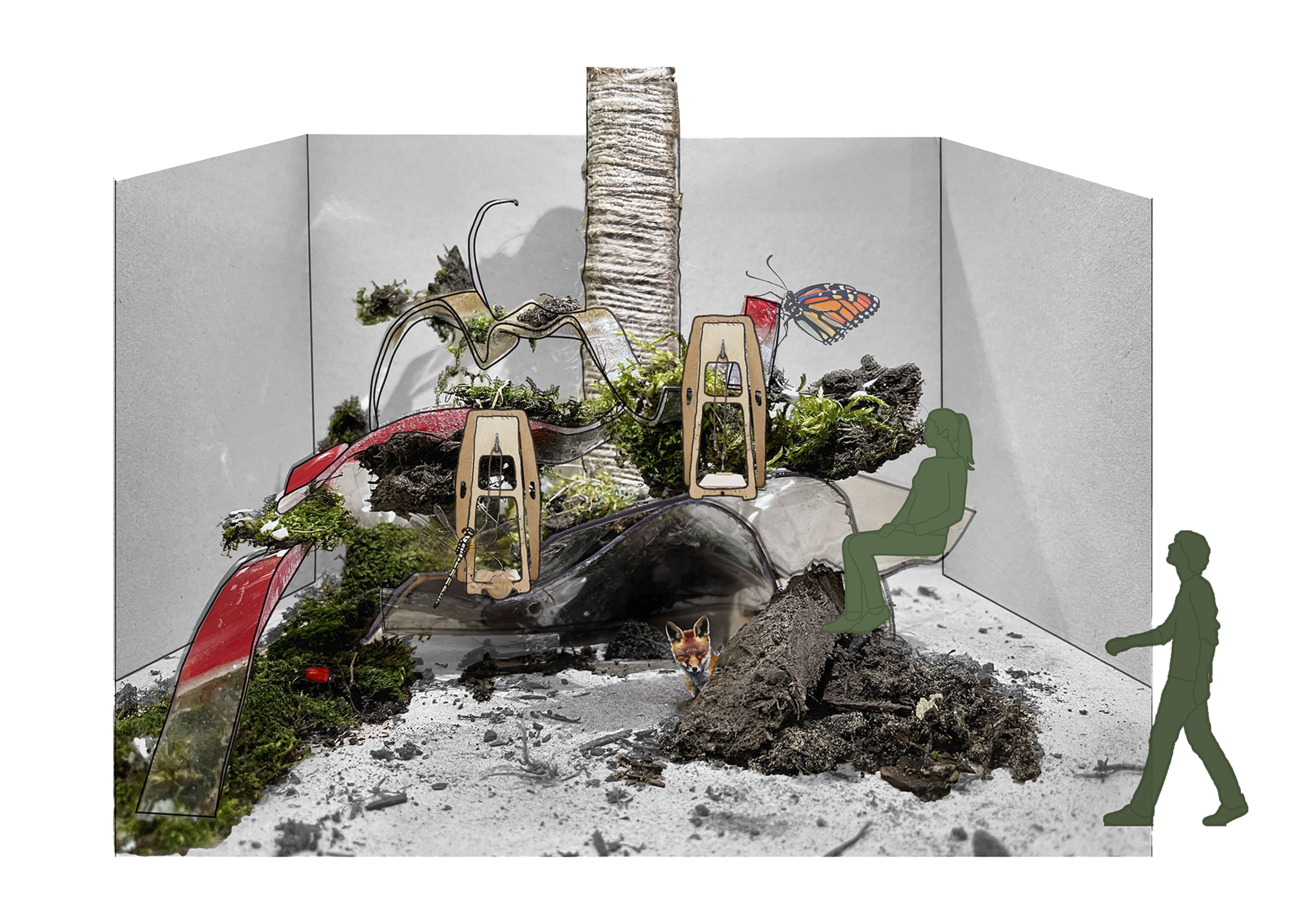 The Anthropocene Landscape is created through an earth plastic materiality that expresses the dominant human influenece on earth. It combines plastic, a man made product, overflowing our planet with nature.